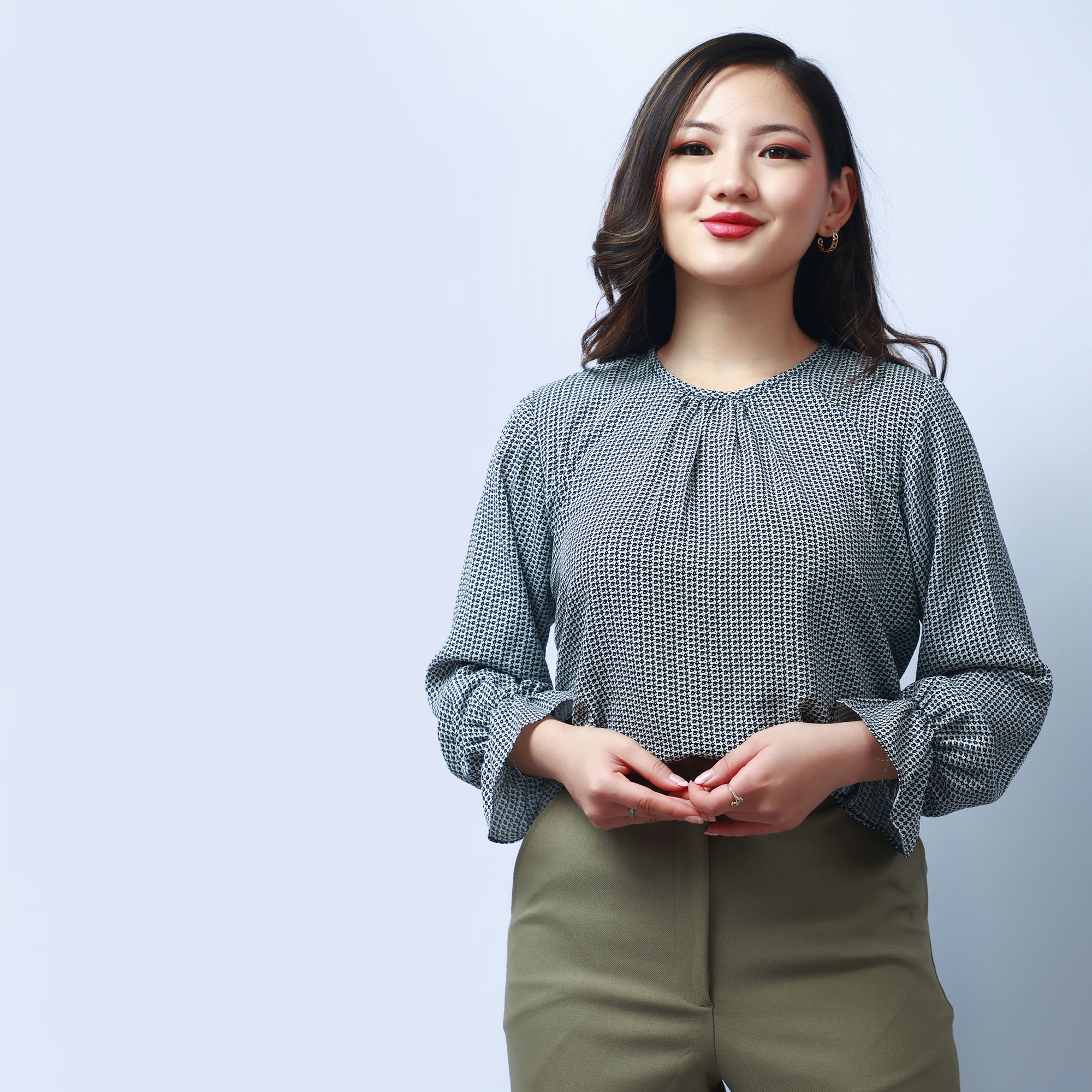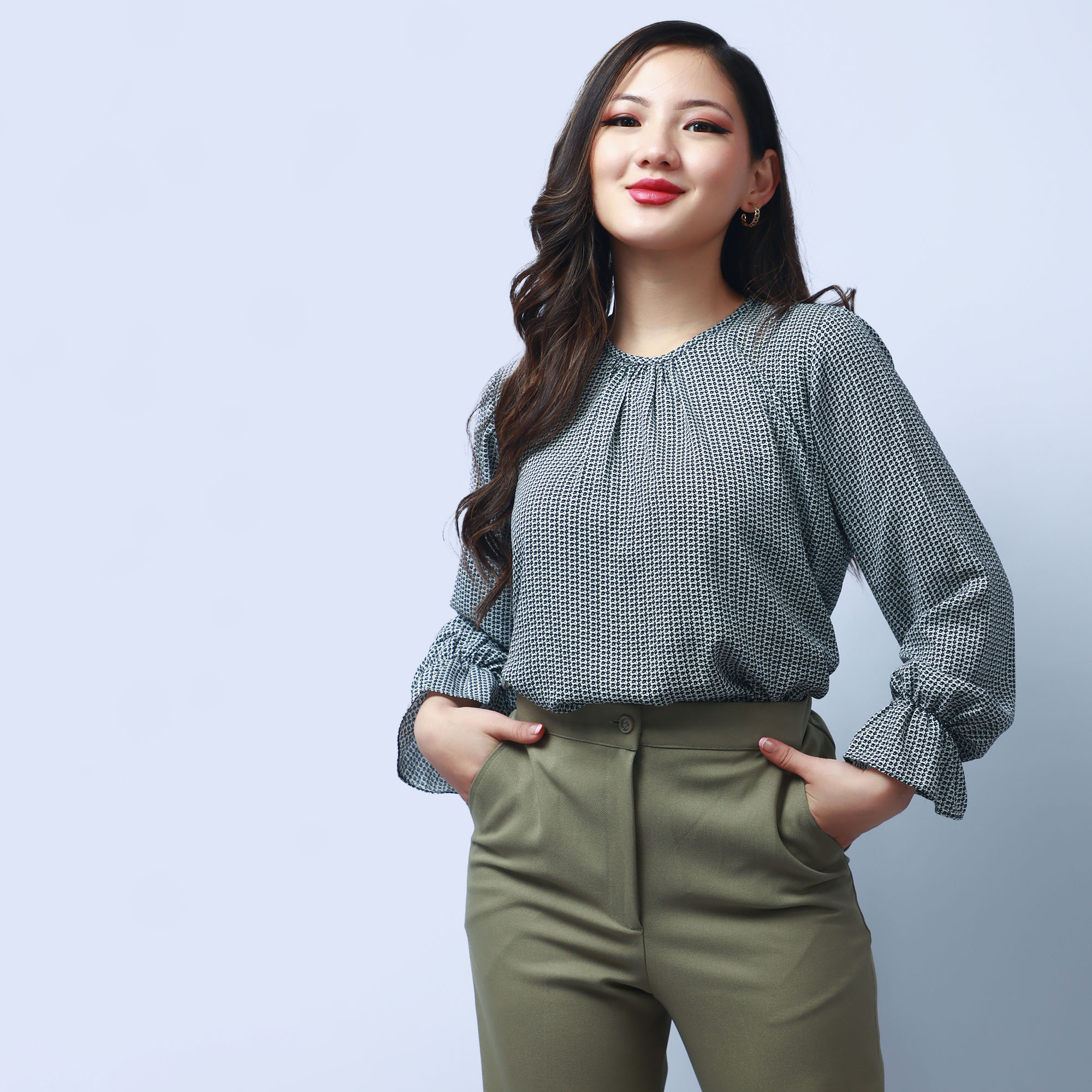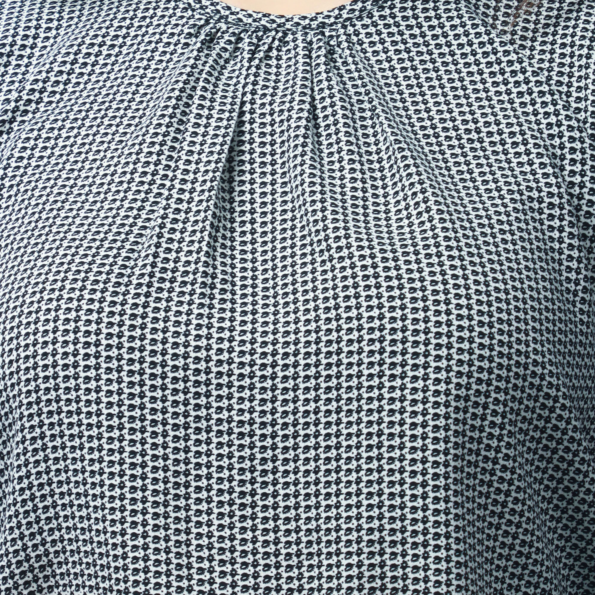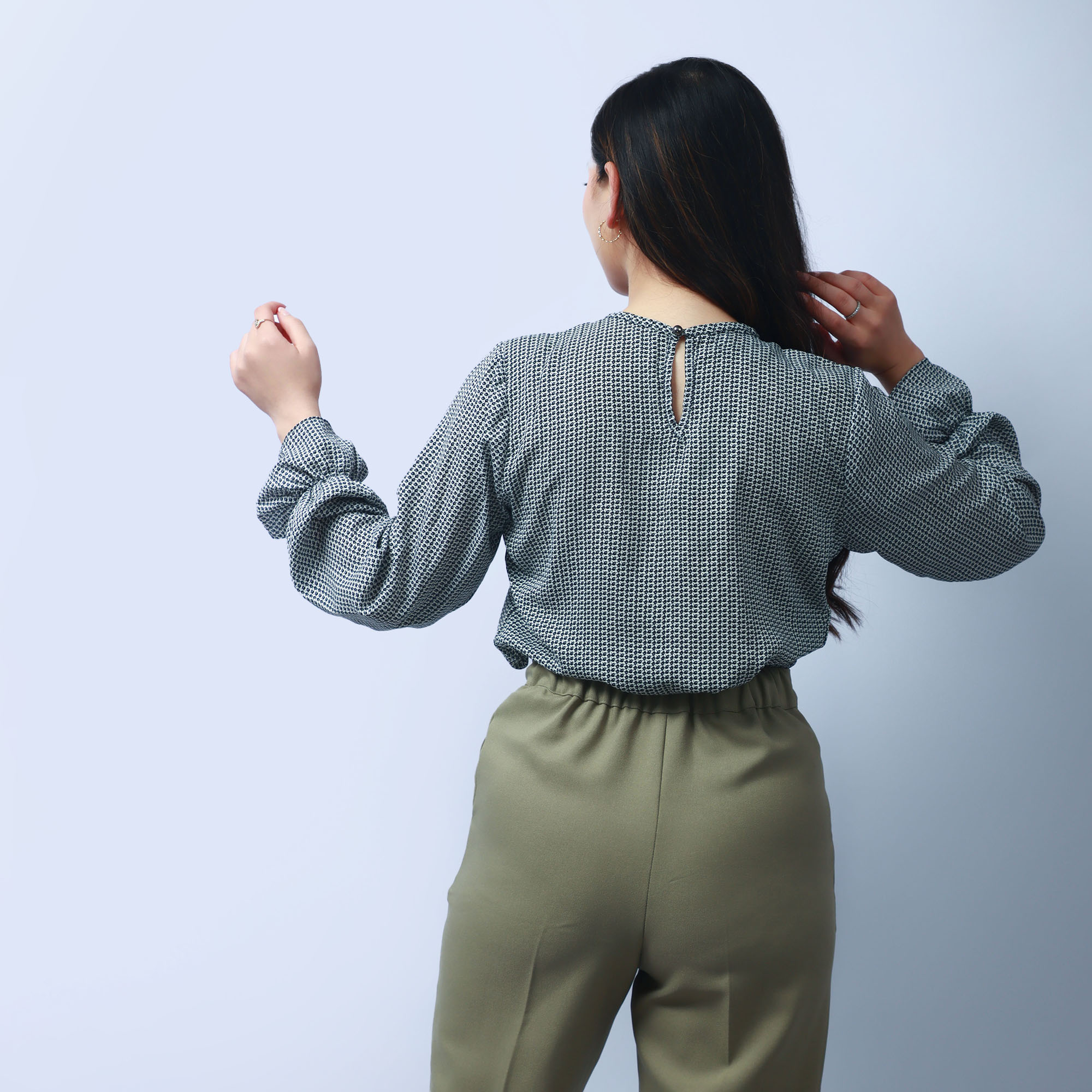 Black/White printed georgette top with round neckline with gathers in front neck. Poet sleeves an keyhole design on the back.