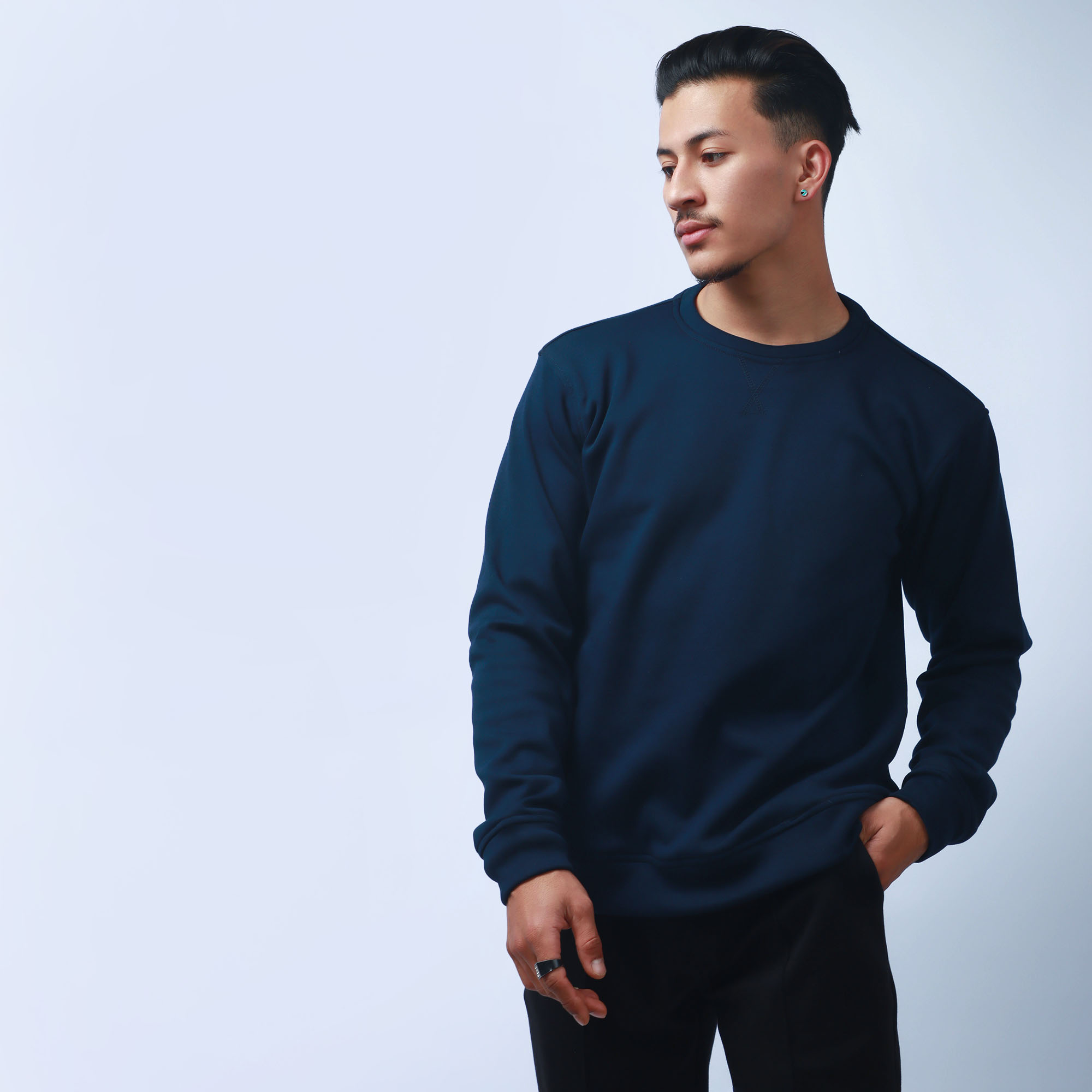 Navy Blue Classic Sweatshirt with a round neck and same fabric rib. V top stitch design on neck.